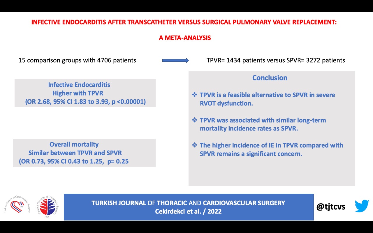 In this meta-analysis, we aimed to compare the incidence of IE in TPV replacement (TPVR) recipients and surgical pulmonary valve replacement (SPVR) patients to identify risk factors for IE and to evaluate the possible impact on mortality.