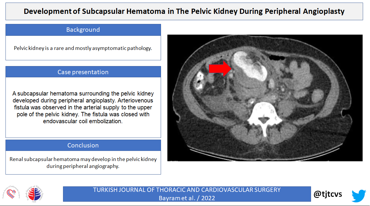 In conclusion, we think that it is vital to evaluate the presence of the pelvic kidney by CTA before peripheral angiography. It is necessary to pay attention to the pelvic kidney during peripheral angiography, and it should be kept in mind that rare complications such as renal subcapsular hematoma may develop.